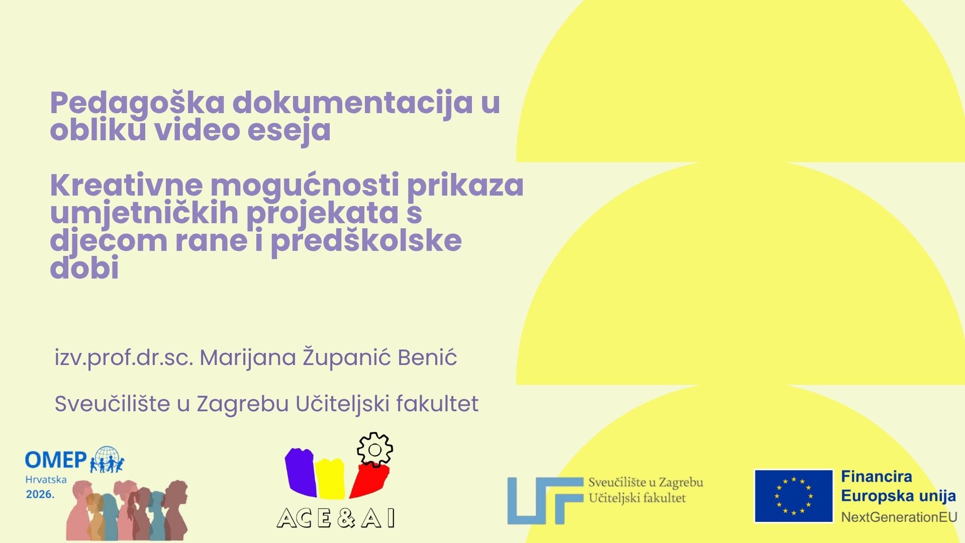 Županić Benić, M. (2026). Pedagoška dokumentacija u obliku video eseja- kreativne mogućnosti prikaza umjetničkih projekata s djecom rane ipredškolske dobi, znanstveno stručni skup OMEP 2026 "Odgoj za mir-kvaliteta odnosa kao temelj promjene", 16. -17.03.2026. Rovinj (izlaganje na konferenciji i predstavljanje projekta ACE&AI)